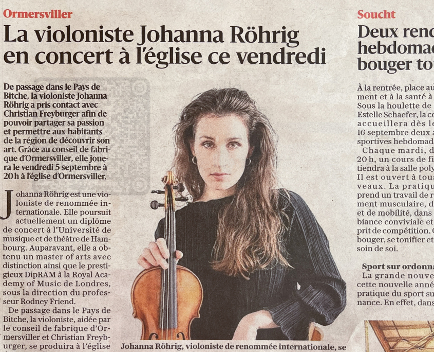 Als vielfache Stipendiatin (Thörl Stiftung/Rogler Stiftung u.a.) spielt Johanna Röhrig zur Zeit auf einer Violine von Andrea Guarneri aus dem Jahre 1686, die ihr durch die J&A Beare’s International Violin Society in London zur Verfügung gestellt wird, und beweist ihr Interesse über die klassische Musik hinaus in genre-übergreifenden Projekten eigener Konzeption, unterstützt vom Deutschen Musikrat, GVL, YAMAHA u.a.